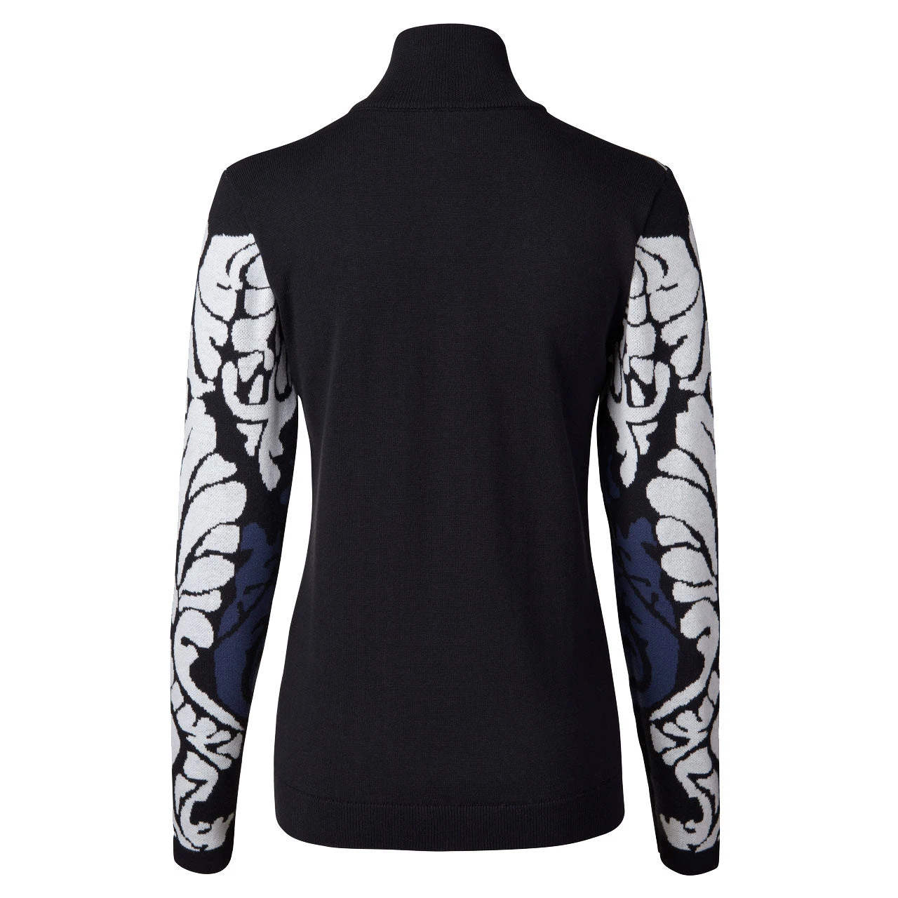 Add some style to your golf wardrobe with the Daily Sports Malgo Womens 1/2 Zip Golf Sweater. It features a mock neck, half zip closure so you can easily customize your coverage and a regal print on a navy background. Perfect to wear alone or as a layering piece.