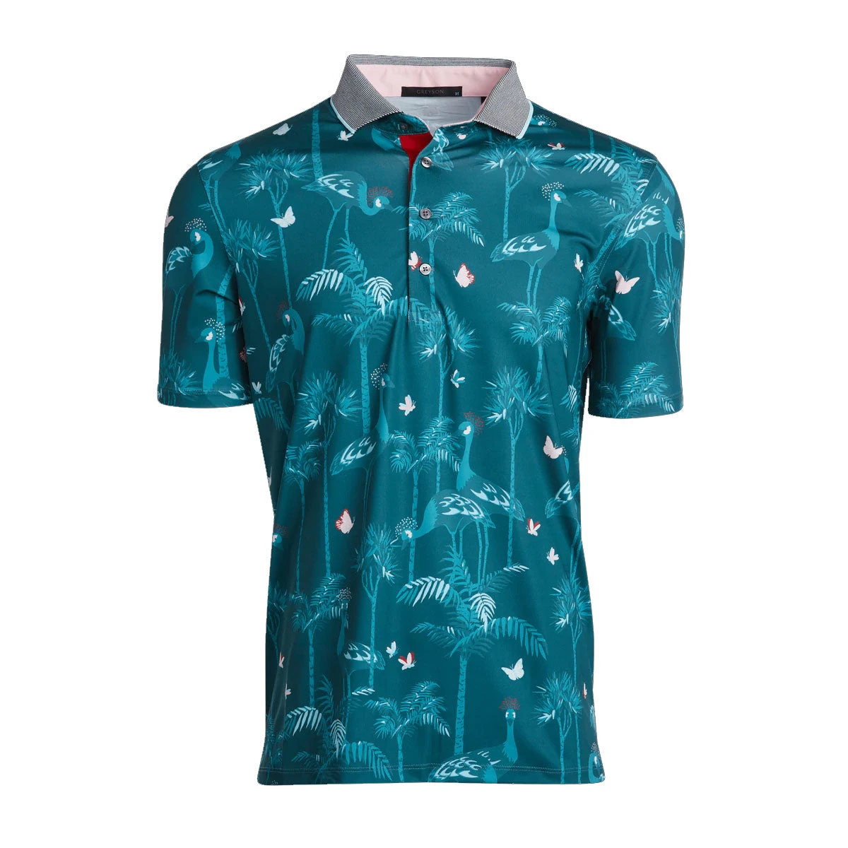 Bring a sense of tranquility to the course with the Greyson Heron Dance Mens Golf Polo. Constructed with antimicrobial and moisture wicking qualities, this polo will provide all-day comfort and freedom of movement. It features a contrast rib knit collar, four button placket, and a beautiful nature-inspired print for an added touch of style.