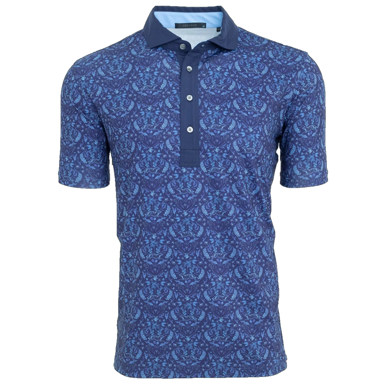 Drawing inspiration from the Michigan Lakeside comes the Greyson Lake Curiosities Golf Polo. This performance golf polo has an all-over pattern with wolves hanging together in harmony in their environment. The Lake Curiosities is built with a super comfortable eight-way stretch that is moisture wicking and antimicrobial to keep you dry, comfortable and smelling fresh throughout your round. The contrasting color of the four button placket and collar add to the style of this polo.