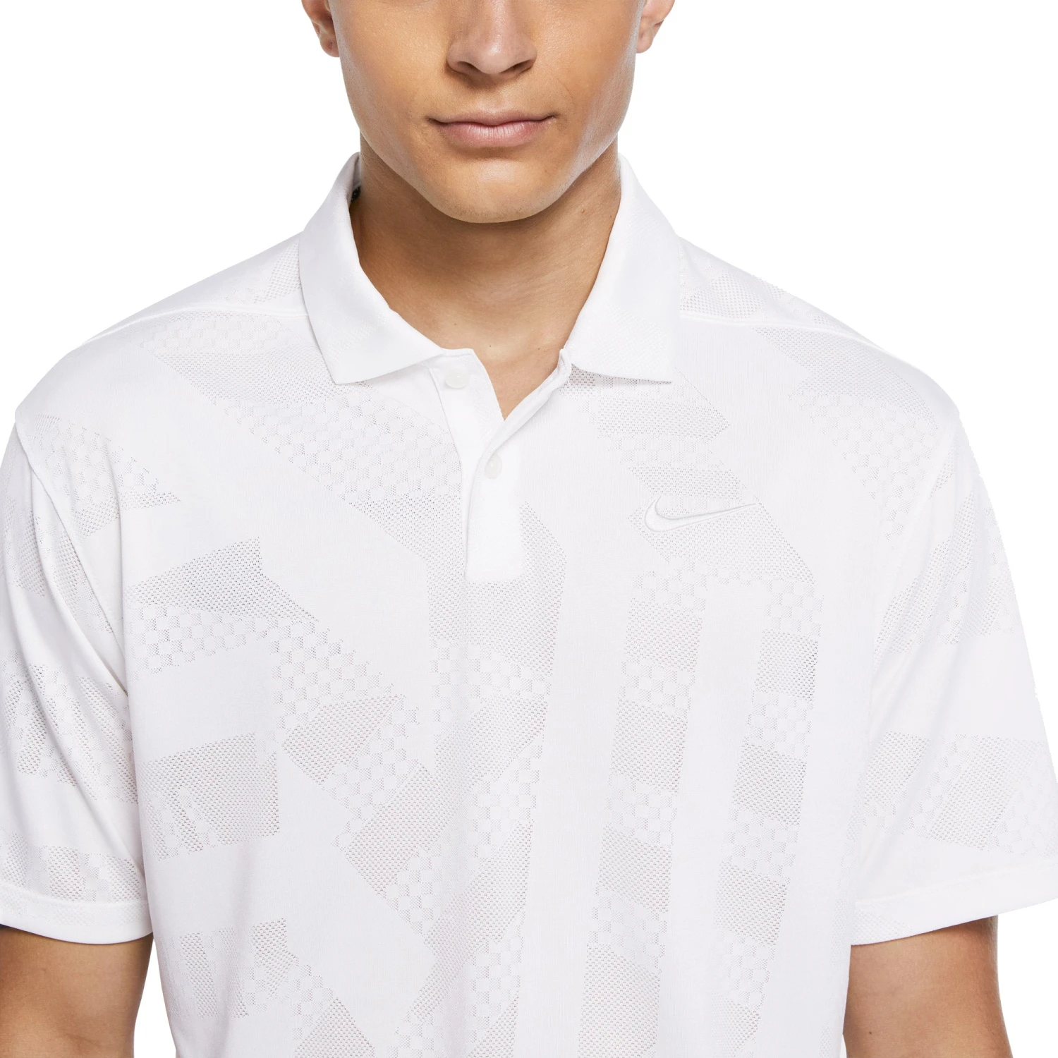 Get a historic design remixed with modern materials in the Nike Dri-FIT Vapor Historic Golf Polo. This polo is built with Nike Dri-FIT that pulls sweat from the body to keep you dry and comfortable during your entire round and mesh at the back of the collar adds breathability in a high heat area. The stretchy knit fabric and rolled forward shoulder seams provide golfers with mobility needed to power through swings. The Geometric pattern is inspired by the complex shapes found on WWI British Navy Warships that was known then as dazzling camouflage which was designed to make it difficult for enemy ships to find them.