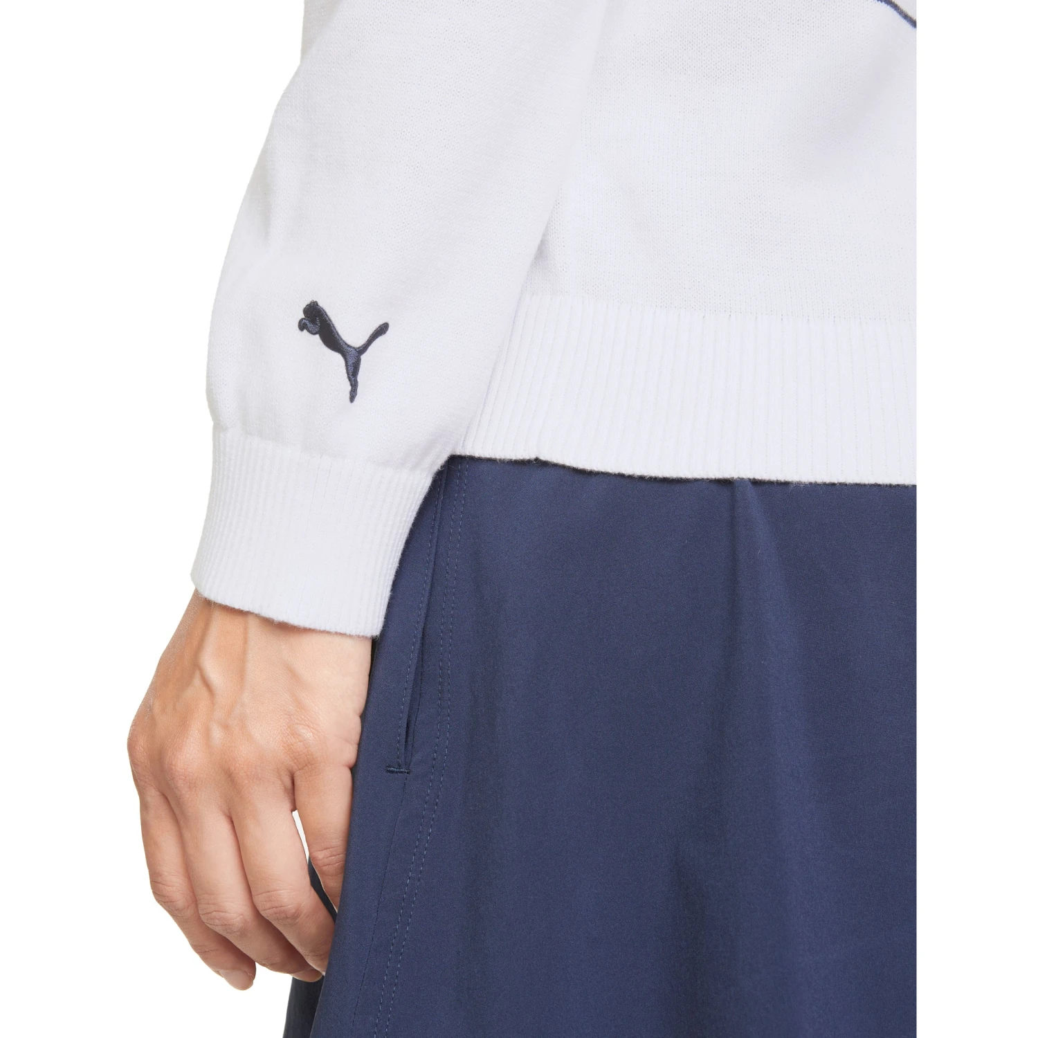 Take your sweater game to the next level with the Puma Striped Golf Sweater. This crewneck sweater will keep you warm and comfortable during cool weather rounds and the striped pattern and Cat logo on the left arm cuff will have you looking good on and off the golf course.