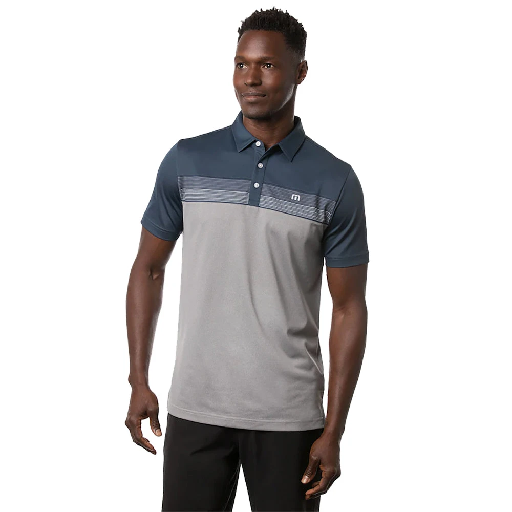 Take your golf style to the next level with the TravisMathew Dinner Cruise Golf Polo. The Dinner Cruise is built with a polyester/spandex blend with an enhanced four-way stretch that will provide supreme comfort throughout the golf swing. There are built-in collar stays that ensure the collar maintains the perfect shape for a stylish look. The cut and sew chest print with color blocked styling and TM logo on the back will have you looking good on and off the golf course.